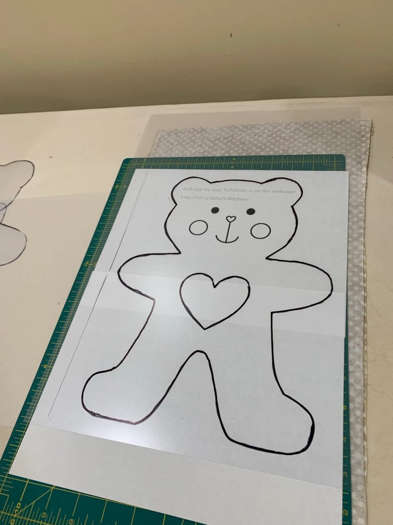 The first one is the Baby Teddy Bear and you can find the pattern at this link. The first one I made for Mo was a smaller version and I followed her instructions sewing through the paper and doing the face after stuffing but I found that challenging so now I trace around my enlarged template with a blue water soluble pen with 2 layers right sides together. I pin and cut them out leaving a generous seam allowance.