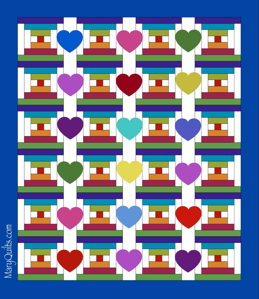 I’ll cut the hearts using my Accuquilt GO die but you can find a heart applique online and size it to your quilt. Use whatever method of appliqué that you like. I’ll fuse my hearts and then stitch them with a blanket stitch … probably by hand but we’ll see. Due to the construction of the top you won’t be able to stitch them on the blocks before sewing them together so I’d suggest assembling the top in two halves, stitch those hearts and then sew the halves together and stitch the last row of hearts in the center.