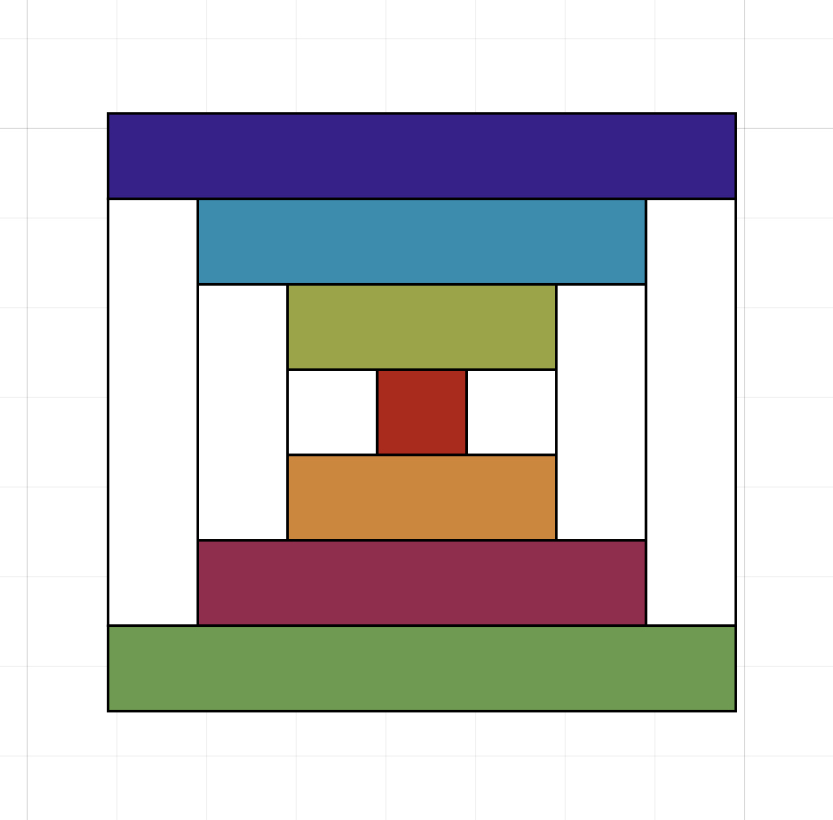 Logs would be cut 2 inches and blocks would finish at 10.5 inches (11 inches with seam allowances). I’ll use the Eleanor Burns way of making log cabin blocks and sew and then trim rather than cutting all the logs to a specific size. The center square will be cut 2 inches square and I will cut those first white squares on either side of it 2 inches too.