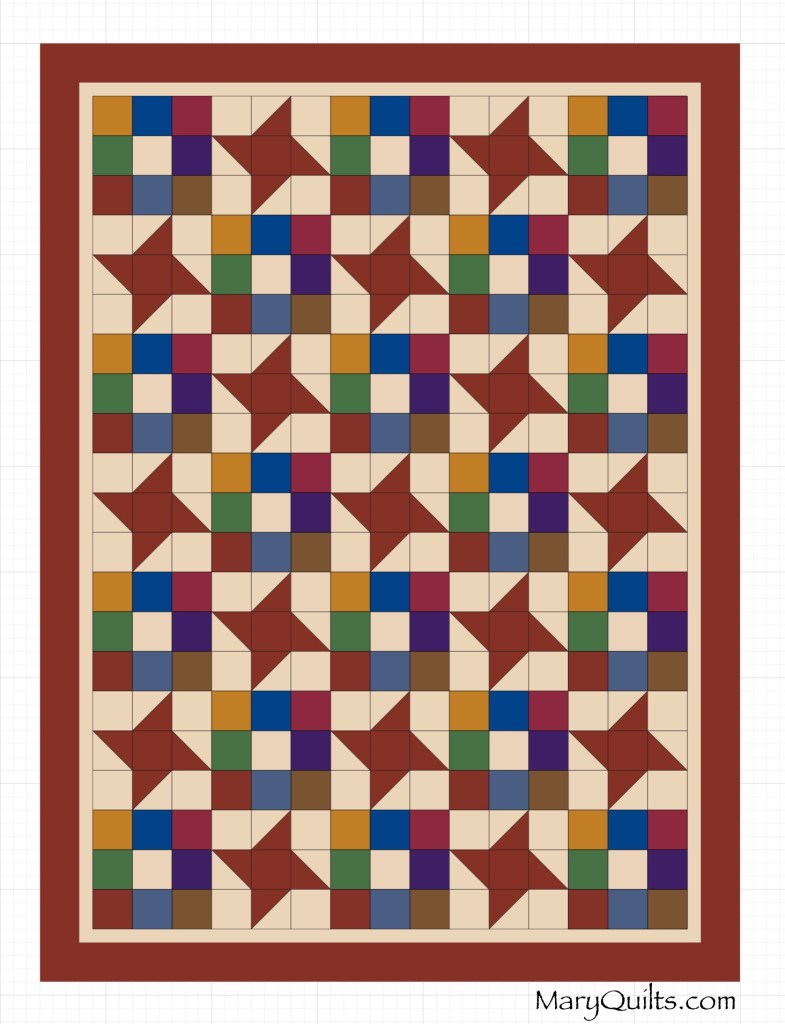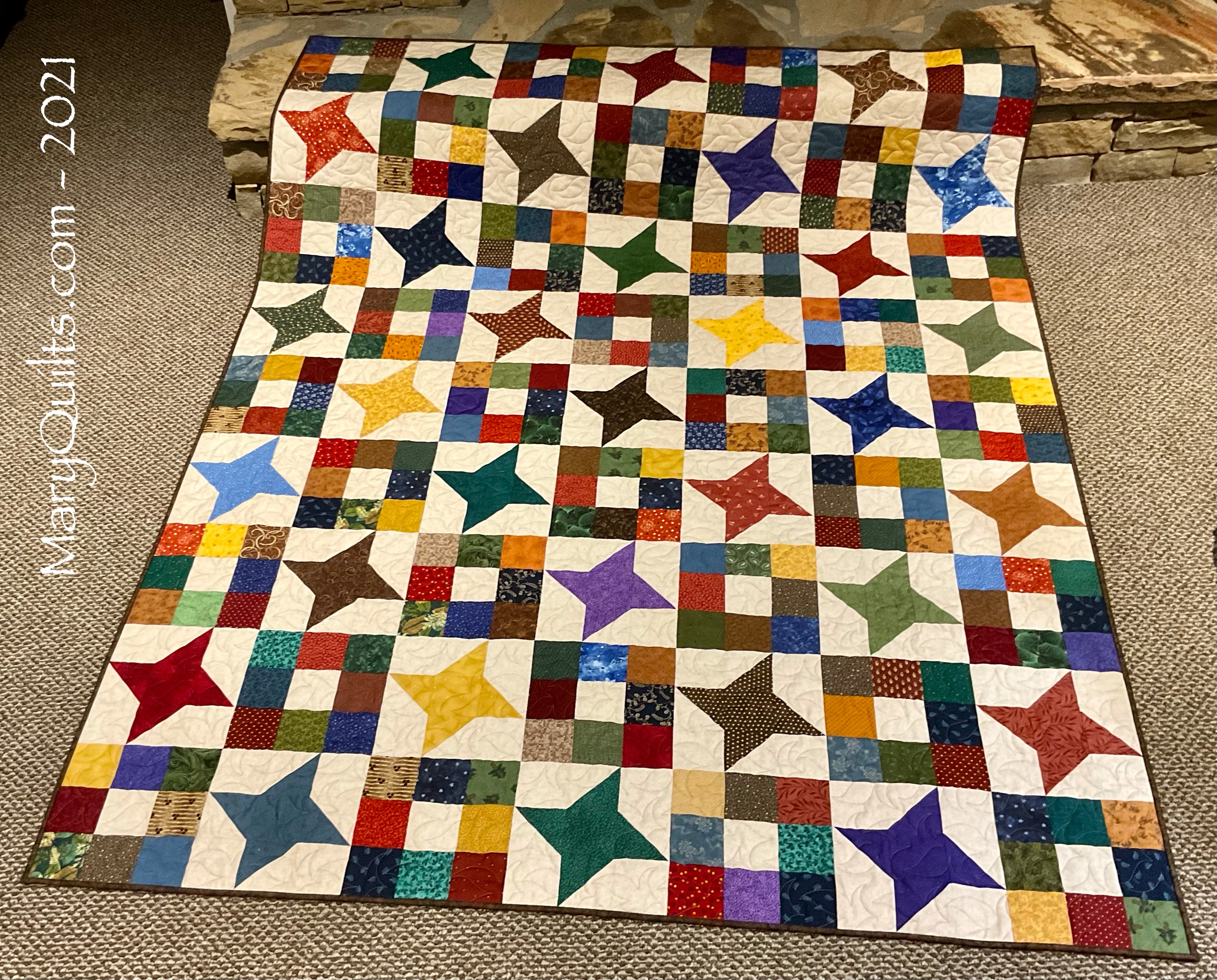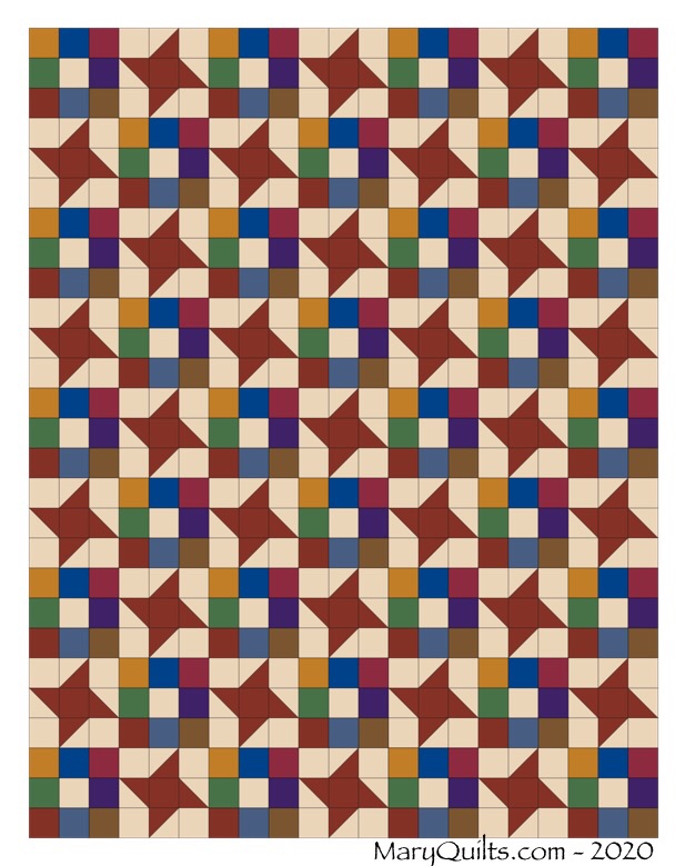My quilt in progress. Please note that my drawing shows all my stars the same color because it’s faster to draw them the same but each star is pieced from a different fabric in my quilt.