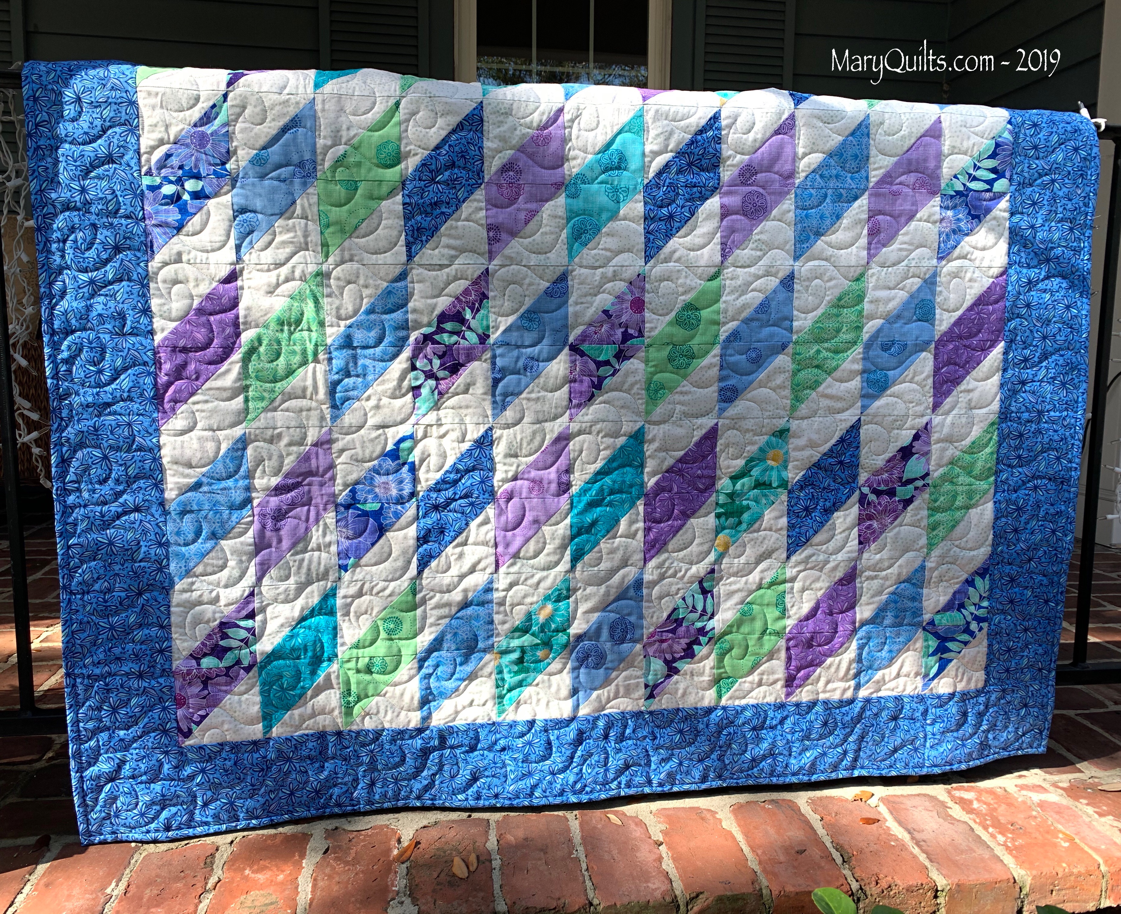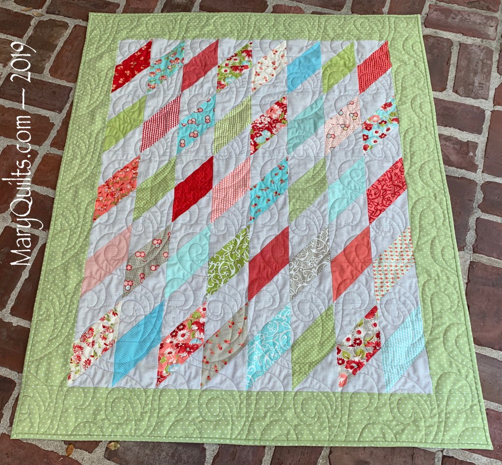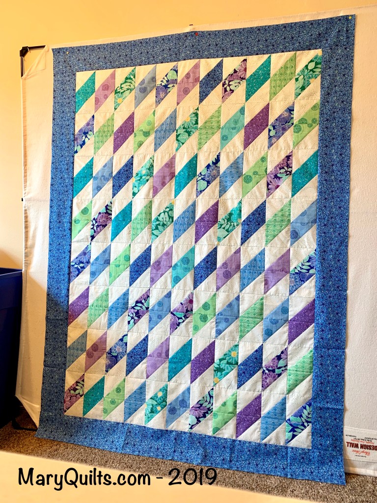 I decided I’d make a larger version of the quilt using a set of fat quarters (plus a background and border fabric from stash) and wrote up some brief instructions. Clicking on the quilt photo below or this link will bring up a PDF with brief notes about my quilt.