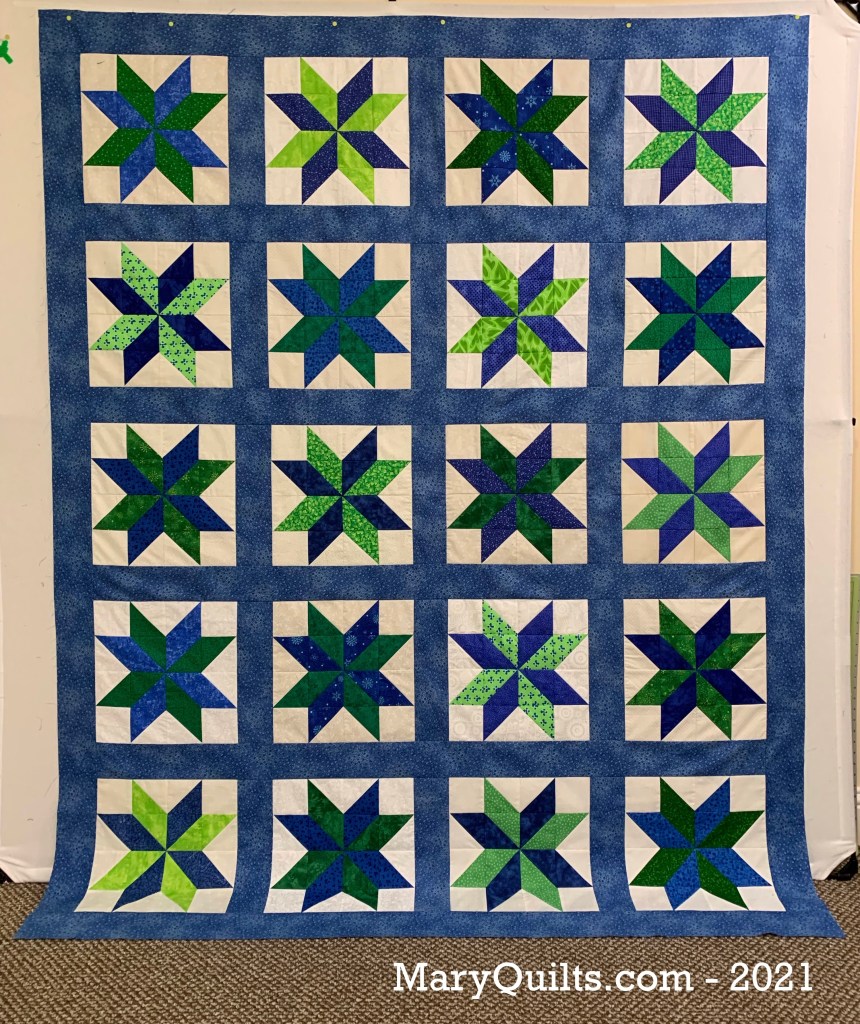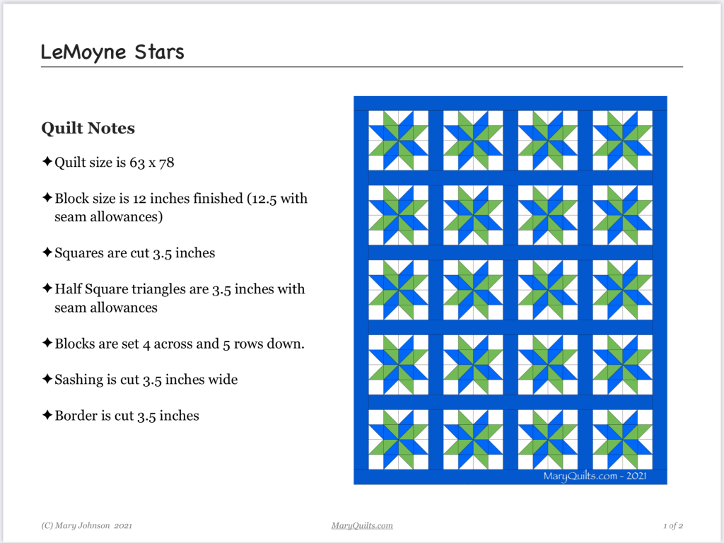 My quilt is scrappy so there are not fabric amounts listed. I have a large piece of blue fabric for my sashing and border – 2 and a half yards will be enough for the sashing, border and binding. Click on the page below to open a PDF with the instructions.