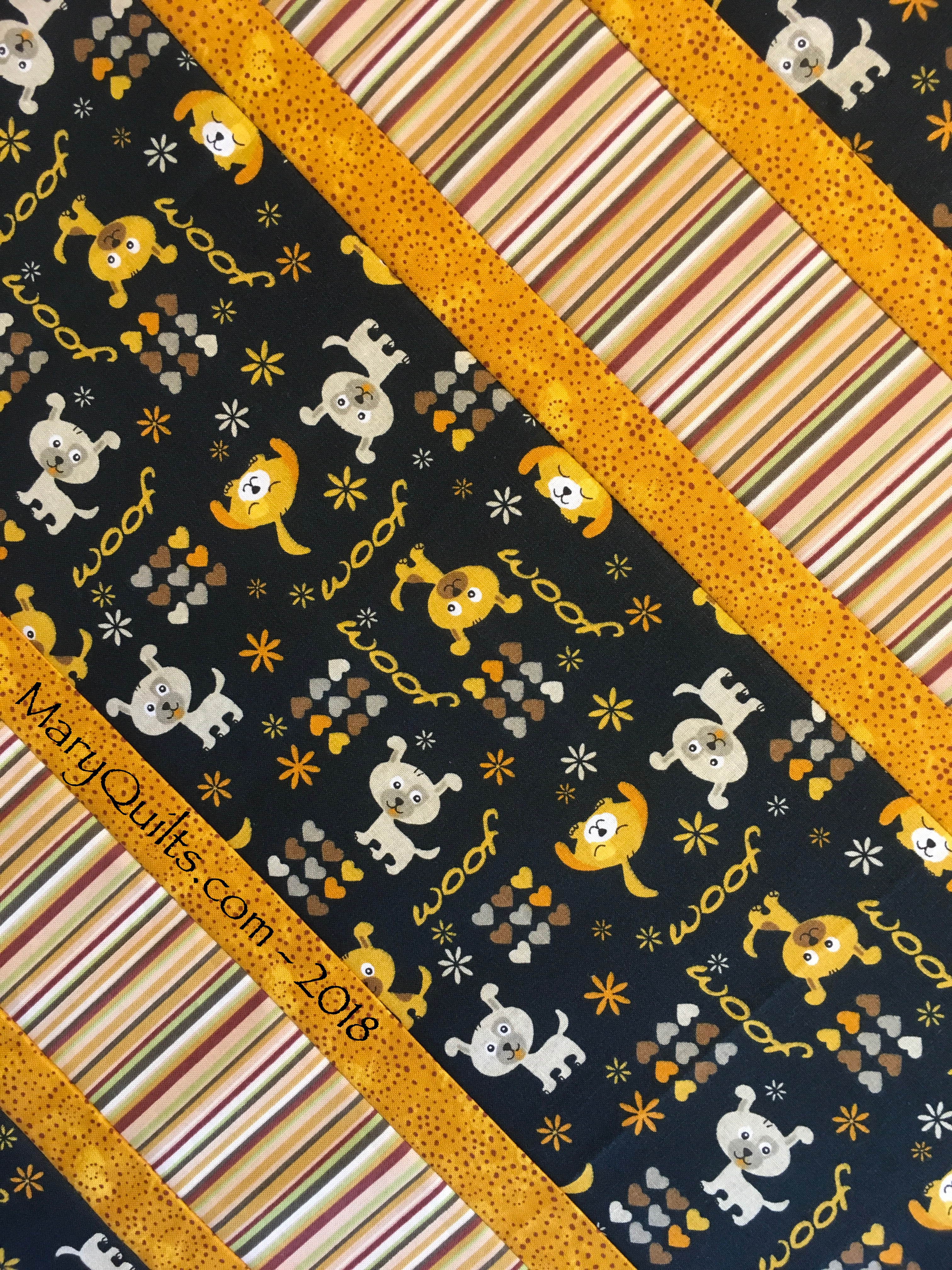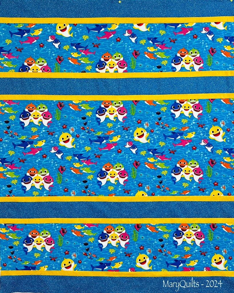 This is my favorite quick donation quilt. Just a yard of a novelty print and two coordinating fabrics from stash and it always looks so cute!