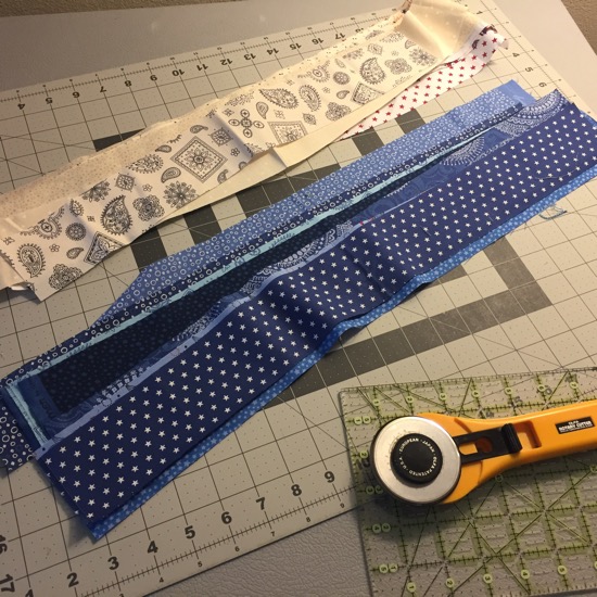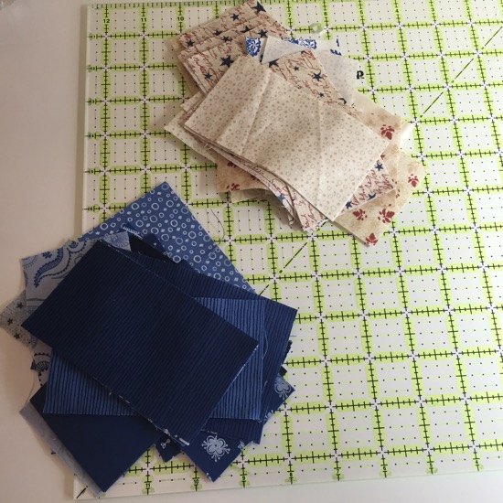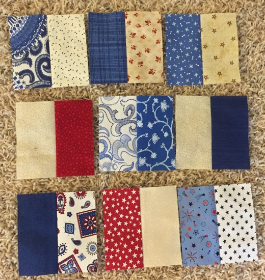 Bricks are 2.5 x 4.5 inches. When my leftovers were too small to make strip sets, I cut individual bricks but if they were larger, I sewed a blue or red 2.5 inch strip to a neutral 2.5 inch strip and subcut it into 4.5 inch sections.  Press to the dark brick.